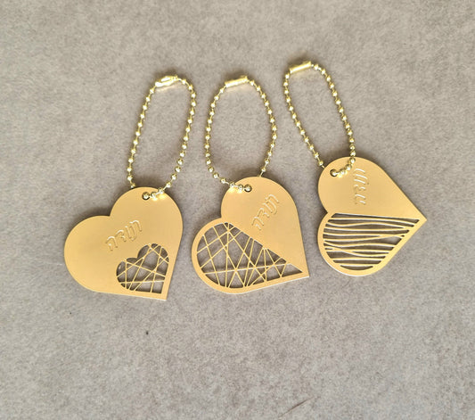 שלישיית מחזיקי מפתחות לב עם חריטה ״תודה״ בציפוי זהב מתנה לגננת