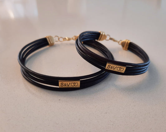 צמיד עור לגבר עם חריטה עם שני שמות | צמיד עור חום כהה