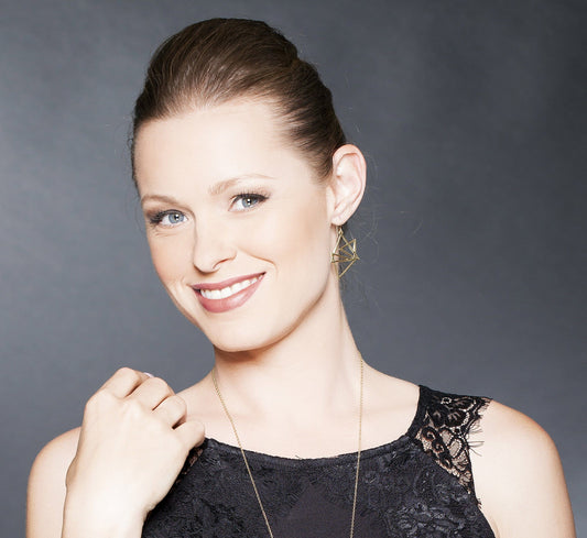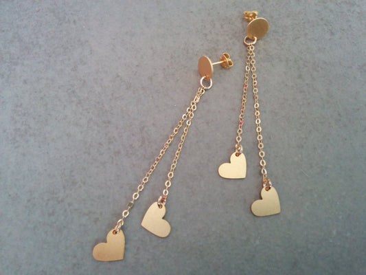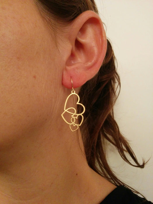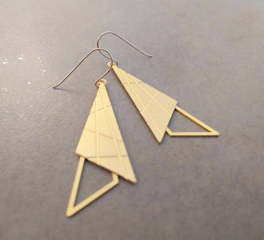 עגילים גיאומטריים מזהב | עגילי זהב תלויים משולשים בשתי שכבות
